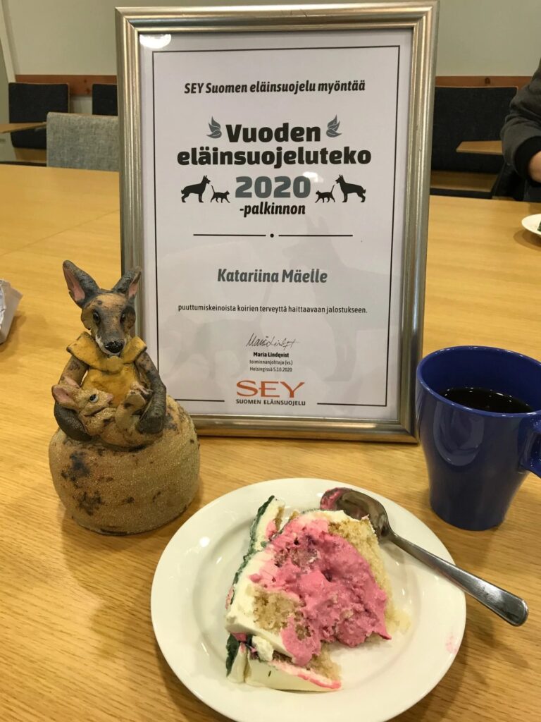 Joka vuosi Eläinten viikolla SEY Suomen eläinsuojelu jakaa Vuoden eläinsuojeluteko -palkinnon henkilölle tai organisaatiolle, joka on toiminnallaan tuonut esiin epäkohtia eläinten oloissa tai edistänyt merkittävällä tavalla eläinten hyvinvointia. Vuoden 2020 eläinsuojeluteko -palkinto jaettiin 5.10. MMT Riitta Kempelle ja MMT Katariina Mäelle selvityksestä koirien jalostukseen liittyvistä ongelmista ja puuttumiskeinoista.