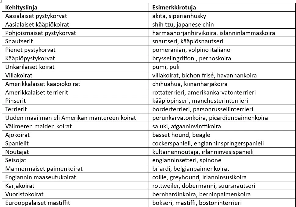 Taulukko 1. Koirarotujen kehityslinjat (Parker ym. 2017).
