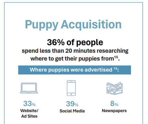 Lähes puolet verkosta ostetuista pennuista vieroitetaan ennen kahdeksan viikon ikää ilman sosiaalistamista tai terveystarkastuksia. Kolmasosa sairastuu pian uuteen kotiinsa muutettuaan. Neljäsosa sosiaalisen median kautta hankituista lemmikeistä kuolee ennen viidettä ikävuottaan.