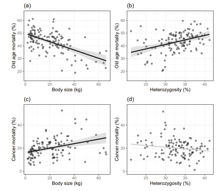 Monimuotoisilla roduilla syöpä oli harvinaisempi kuolinsyy (kaavio d), ja siihen kuoltiin vanhemmalla iällä kuin vähemmän monimuotoisissa roduissa. Löydös ei kuitenkaan ollut tilastollisesti merkitsevä. Syynä tähän saattaa olla, että sukusiittoisuuden ja alhaisen monimuotoisuuden syöpäriskiä lisäävä vaikutus ei välttämättä ole suoraviivainen.