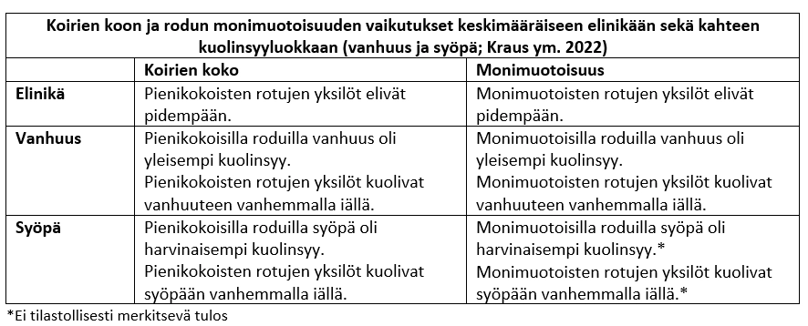 Kraus ym. 2022. How size and genetic diversity shape lifespan across breeds of purebred dogs. GeroScience. https://doi.org/10.1007/s11357-022-00653-w.