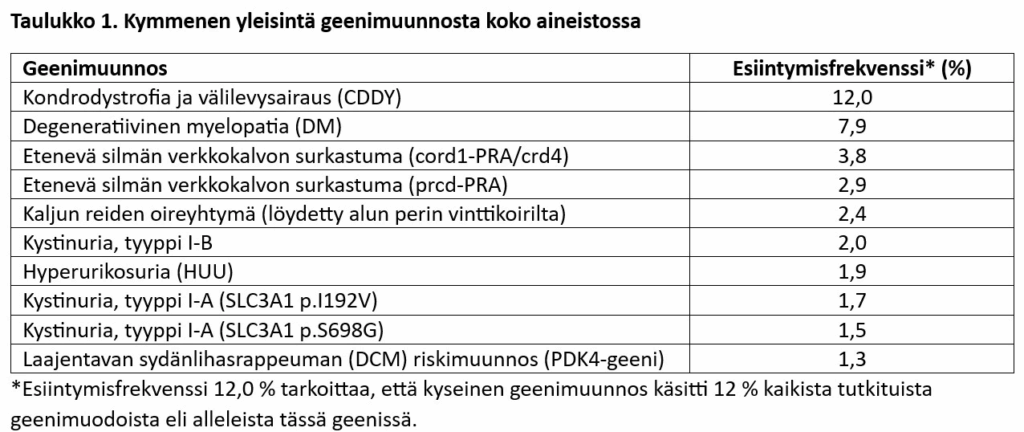 Koko aineiston yleisin geenimuunnos oli kondrodystrofiaa aiheuttava ja välilevysairauteen liittyvä kromosomin 12 retrogeeni eli CDDY (Taulukko 1). Sen esiintymisfrekvenssi oli monirotuisilla koirilla 11,4 % ja puhdasrotuisilla 13,9 %. Rotuja, joissa sen frekvenssi oli vähintään 1 %, oli 89.