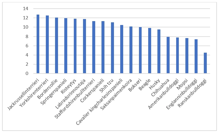 Rotujen välillä oli suuria eroja. Jackrussellinterrierillä oli alussa korkein elinajanodote (12,72), seuraavina olivat yorkshirenterrieri (12,54), bordercollie (12,10) ja (englannin)springerspanieli (11,92; Kaavio 3).