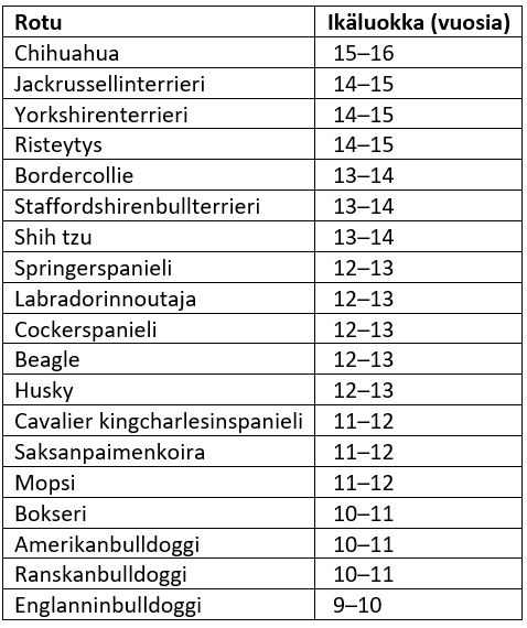 Ikäluokka, jossa odotettavissa olevan elinajan pituus laski alle 1,5 vuoden, oli korkein chihuahualla (15–16 vuotta). Seuraavina tulivat jackrussellinterrieri, risteytykset ja yorkshirenterrieri (Taulukko 1). Englanninbulldoggilla tämä ikä oli alhaisin (9–10 vuotta), sitten tulivat bokseri, ranskanbulldoggi ja amerikanbulldoggi.
