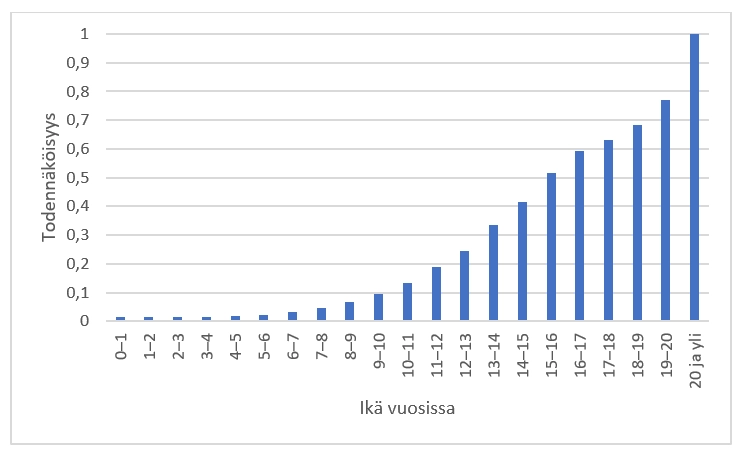 Kuoleman todennäköisyys kullakin vuosivälillä kasvoi iän myötä. Ennen viittä ikävuotta todennäköisyys pysyi kahdessa prosentissa tai sen alapuolella ja alkoi sen jälkeen nousta (Kaavio 2).