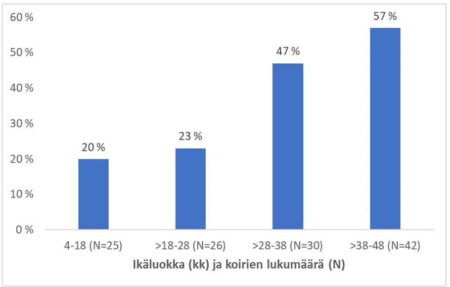 Nivelrikkokoirien osuus kasvoi ikäluokittain nuoremmasta vanhempaan mentäessä (Kuva 2). Samoin osuus kasvoi koiran painon kasvaessa.