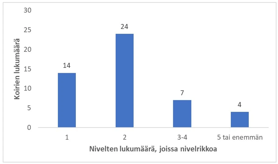 Noin 40 prosentilla koirista (49 koiraa) oli nivelrikkoa vähintään yhdessä tutkitussa nivelessä. Koirista 24:llä nivelrikkoa oli kahdessa, seitsemällä 3-4:ssä ja neljällä useammassa kuin viidessä nivelessä (Kuva 1).